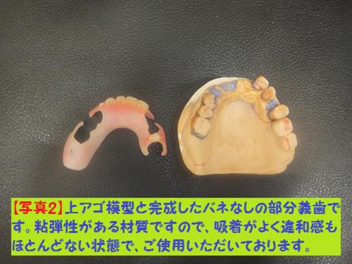 比較的硬さのある保険義歯とは異なり, 今回のものは柔らかさがあり吸着性と衛生的にも優れた義歯です。口内にセット(装着)し半年以上経ちましたが, 違和感もなく毎日おいしく食事をお摂りいただいております。